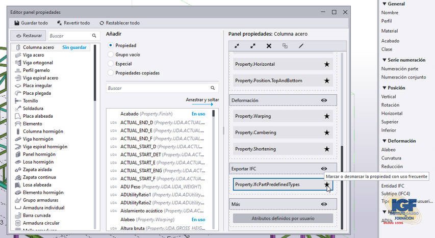- En la columna de la izquierda selecciona el componente al que quiere personalizar el panel de propiedades, para este caso Columna acero.
